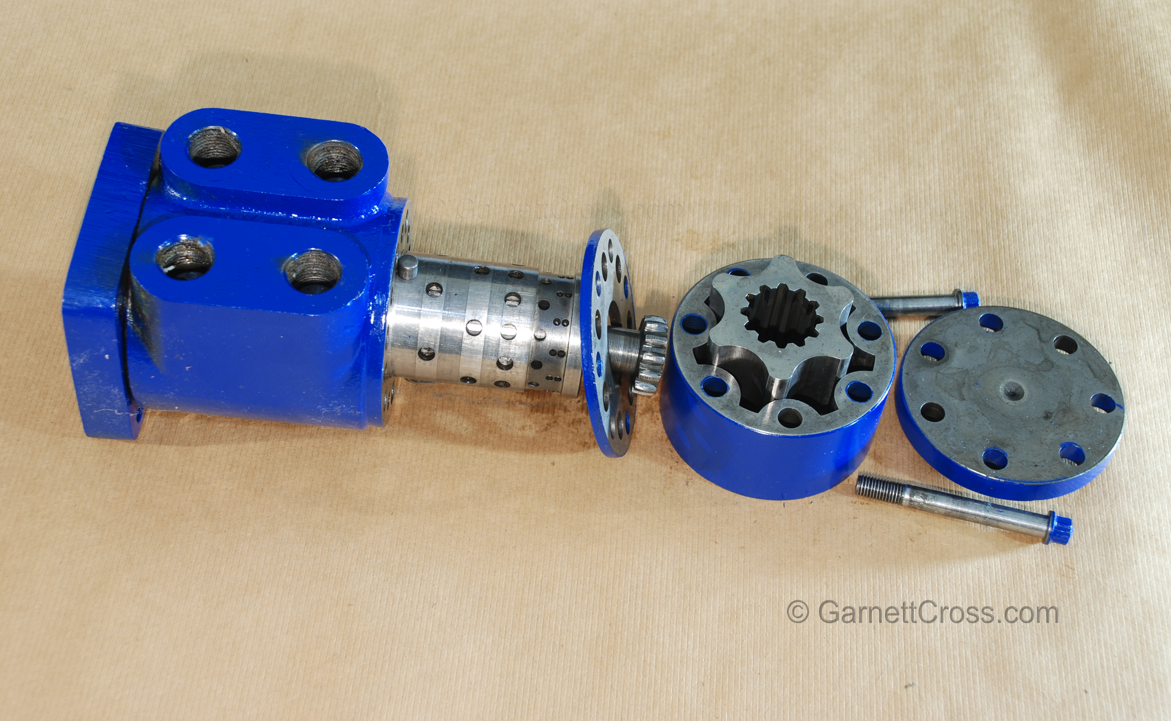 | Oil Hydraulics Orbitrol Steering Valve For this model the individual components are arranged as it should be assembled. Ports positioned to the top, pin standing vertical through the directional control valve, rotor shaft slot inserted vertically over the vertical pin, the rotor at the bottom with teeth straddling the top lobe of the rotor ring. Confirm configuration for the individual model being used. (Spacer ring not displayed) |