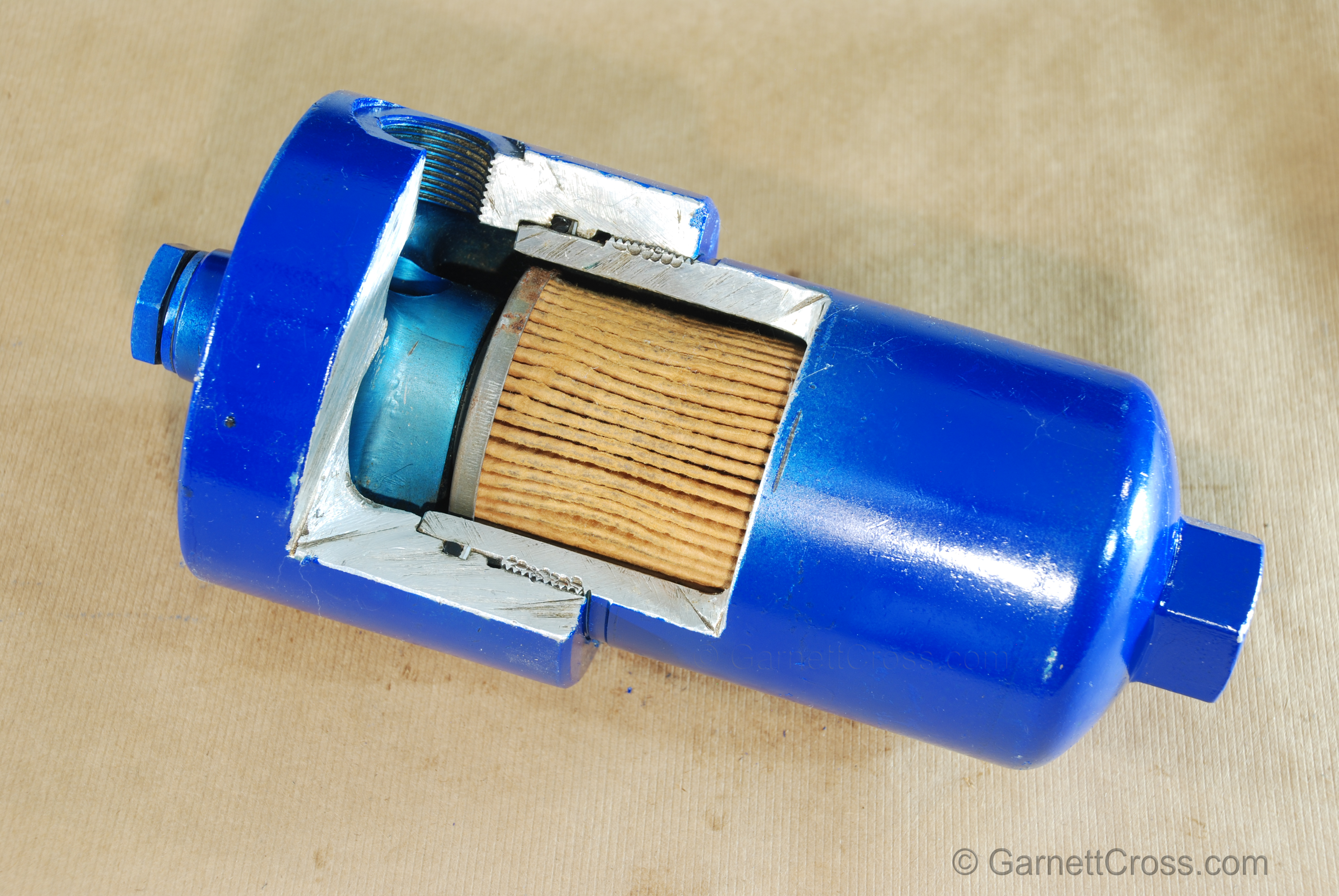 | Oil Hydraulics Oil Filter cross section. Note: Filters must be sized to 1.5 times the flow rate to pass through the filter, to avoid collapsing the element. See resources for additional details |