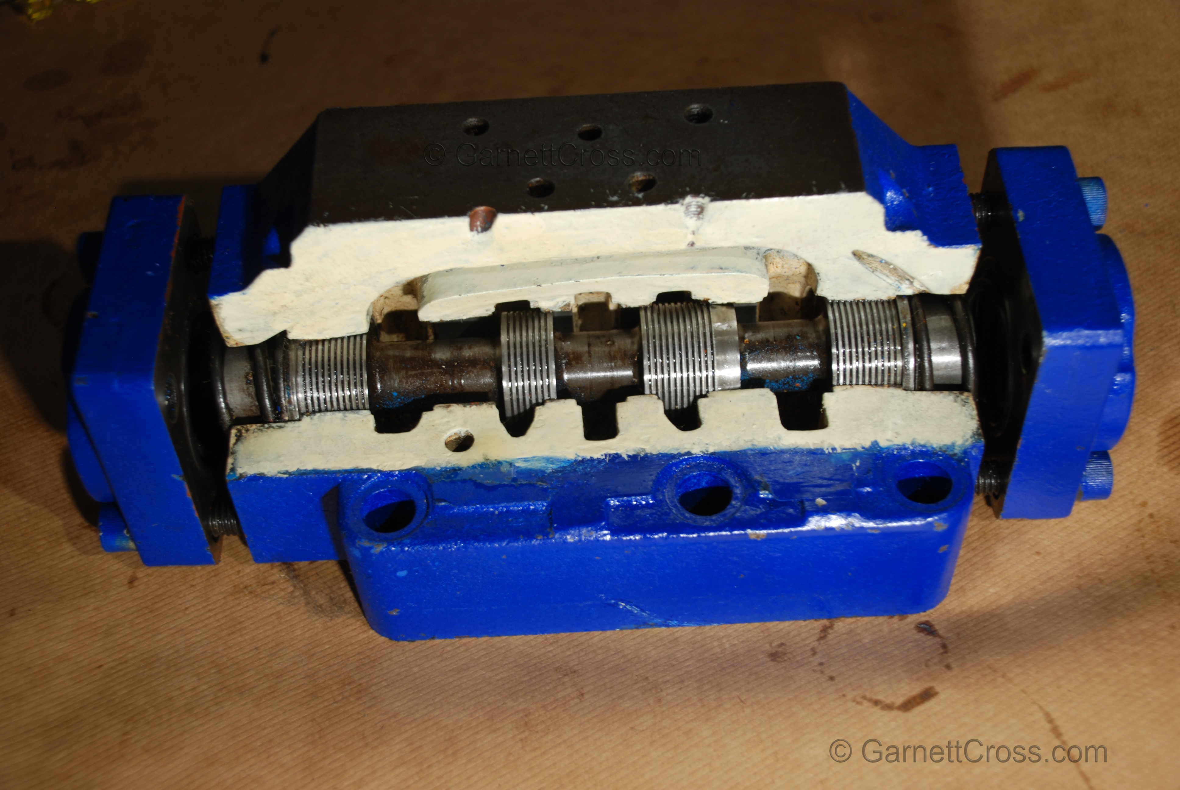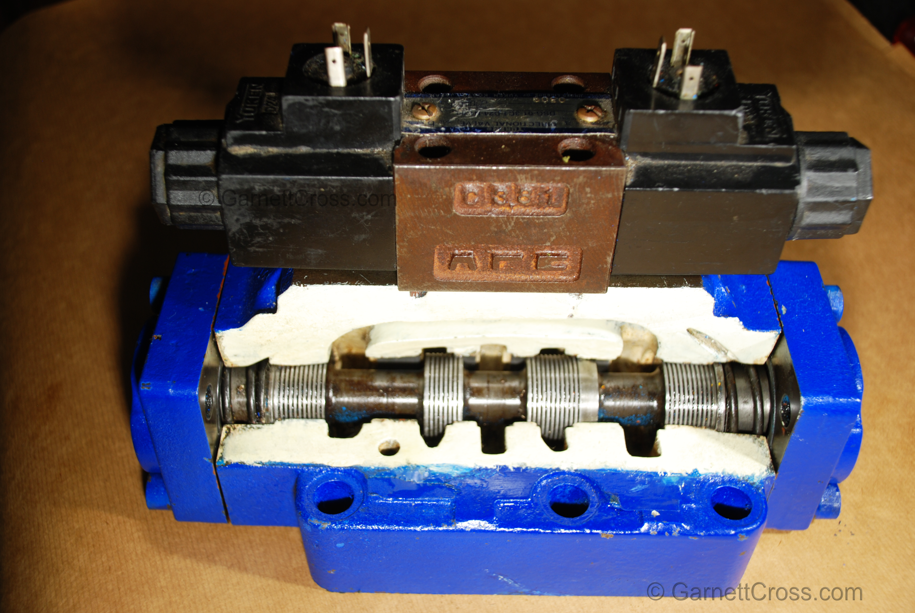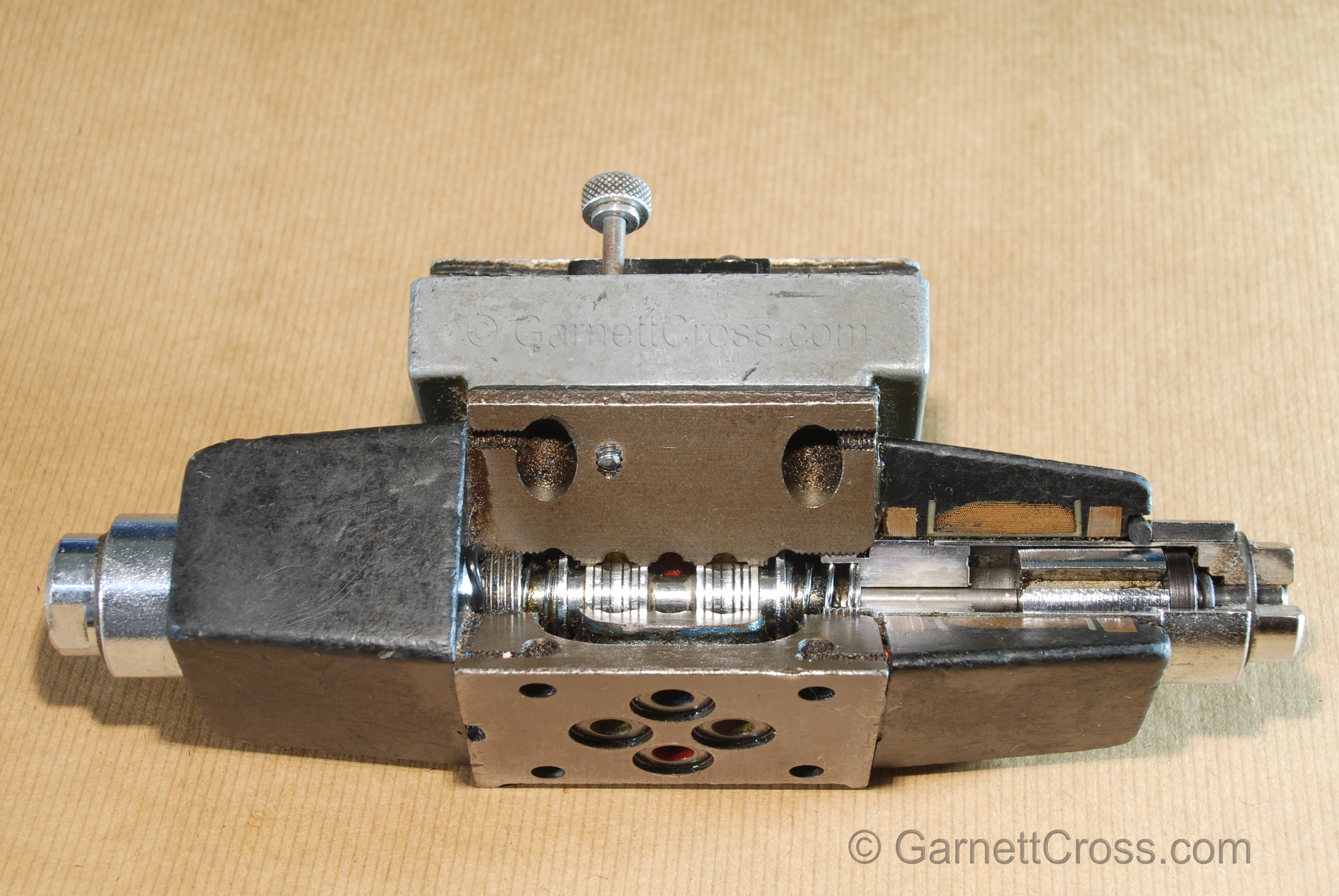 | Oil Hydraulics NG25 Pilot Operated Directional Control Valve cross section and spool removed. See resources for additional details |