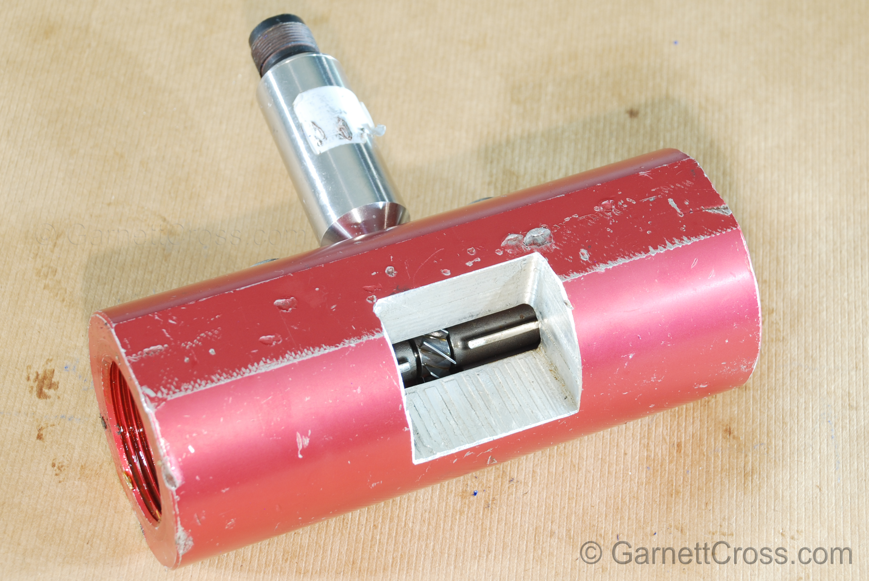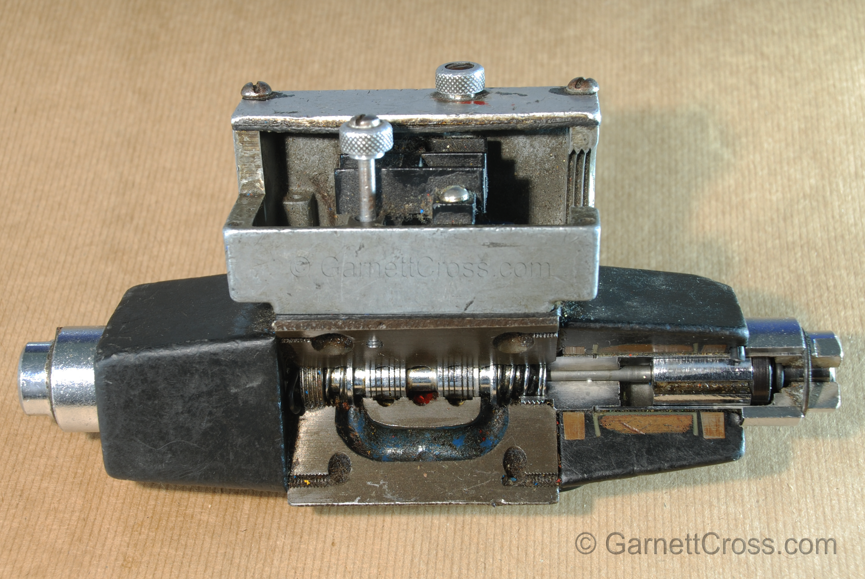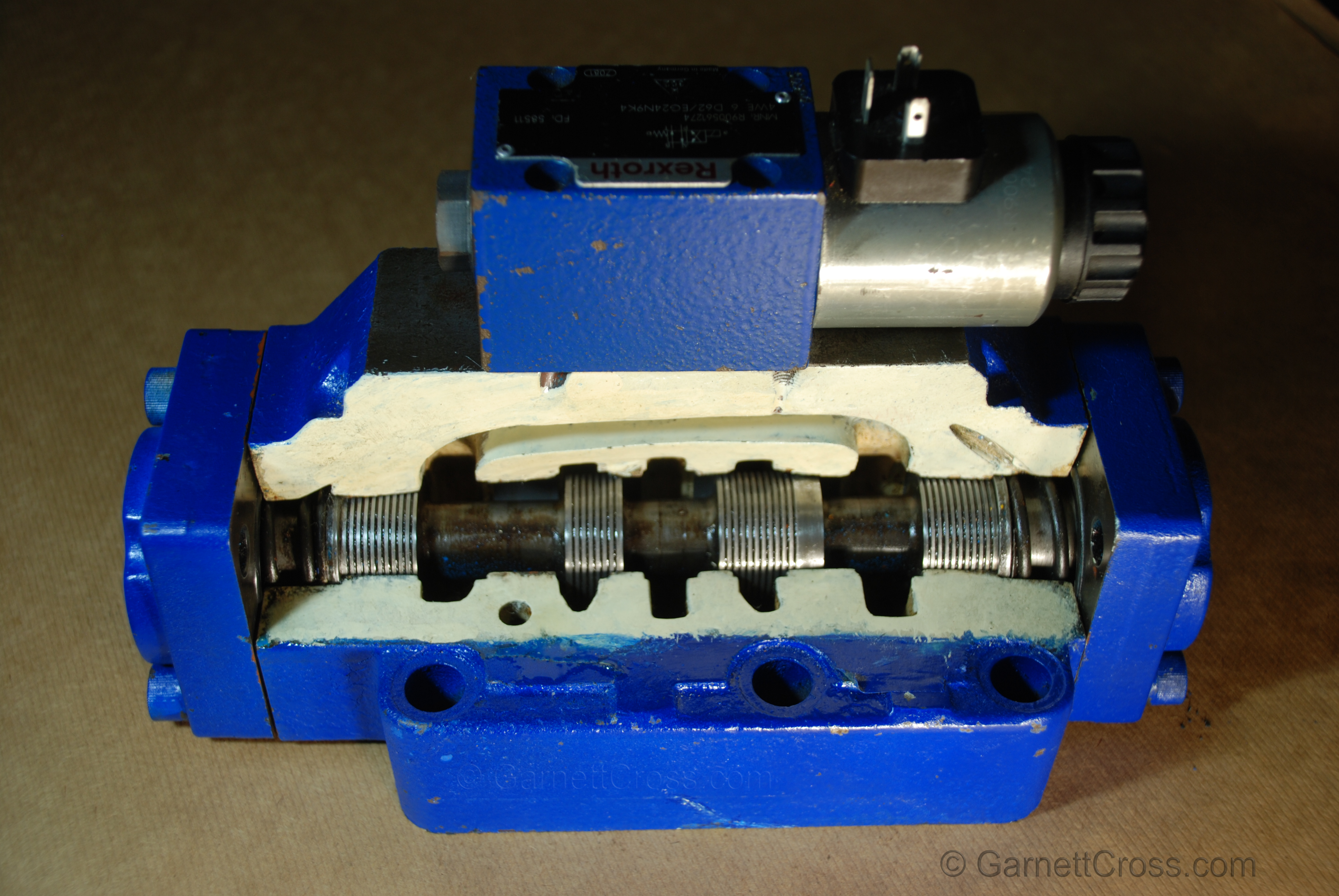 | Oil Hydraulics NG25 Pilot Operated Directional Control Valve cross section and spool removed. See resources for additional details |