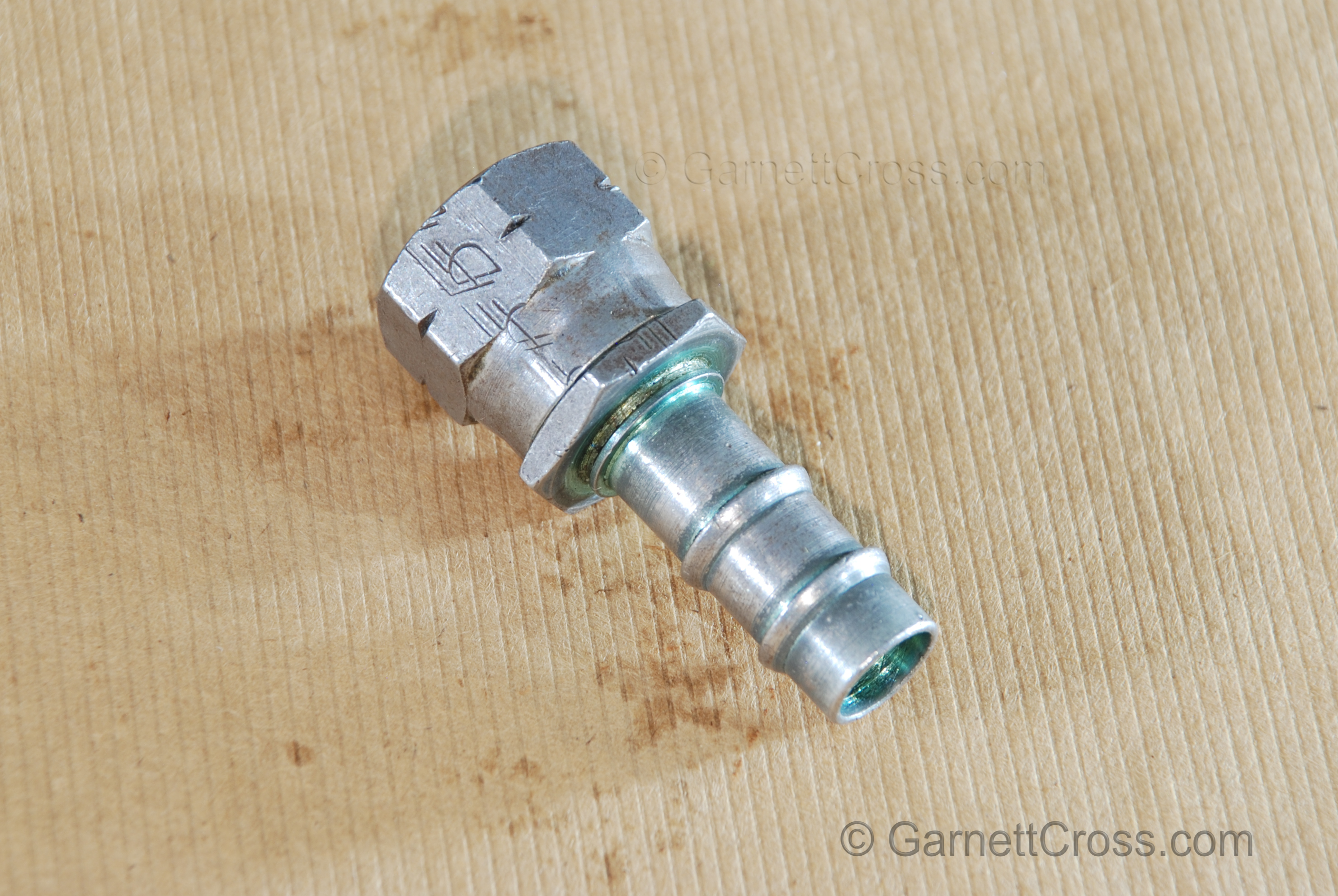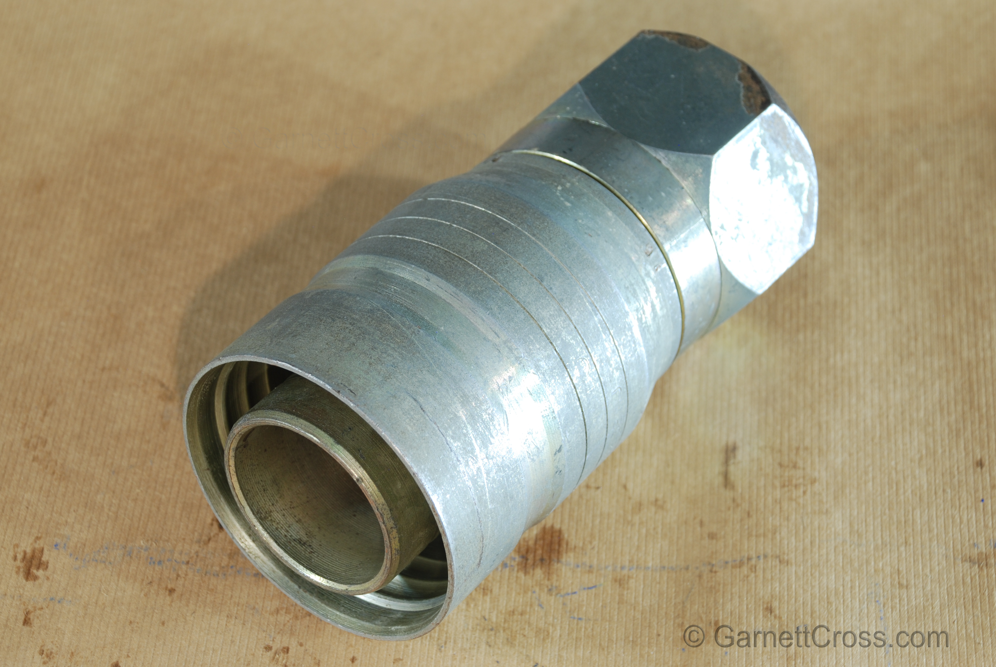 | Oil Hydraulics example of swaged fitting that had been over crimped collapsing the insert. Note: This caused unnecessary time loss to the plant trying to determine the cause of zero flow. |
