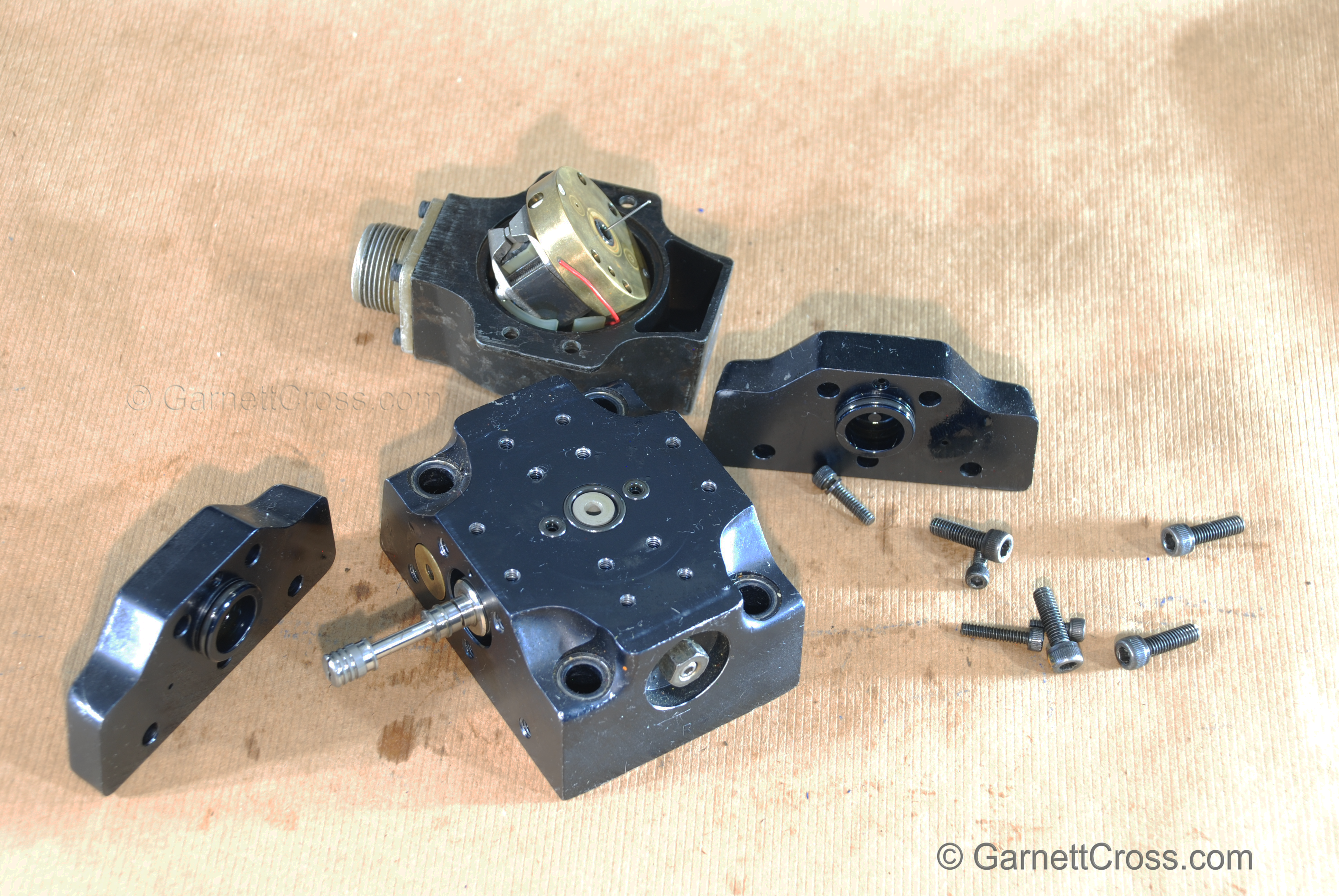 | Oil Hydraulics Moog Servo Controlled Valve disassembled. Note: Each servo valve must have a dedicated 3 micron filter in the pressure supply line for the valve. |