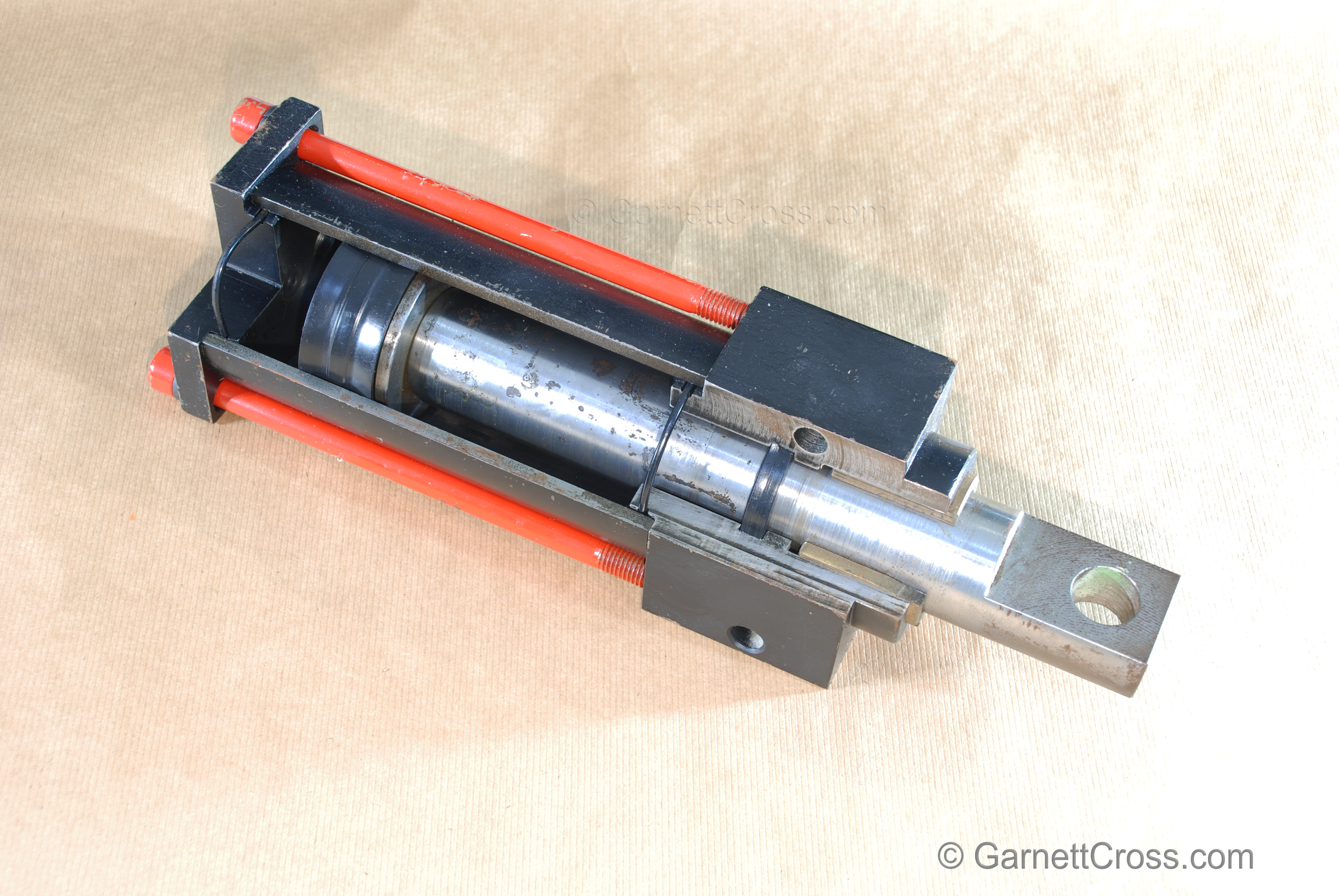 | Oil Hydraulics Cylinder Note: This cylinder is poorly designed, the rod seal is behind the rod bushing, preventing lubrication to the rod bush and no rod wiper seal on the rod is present to keep contaminants out of the rod bushing. See resources for additional details |