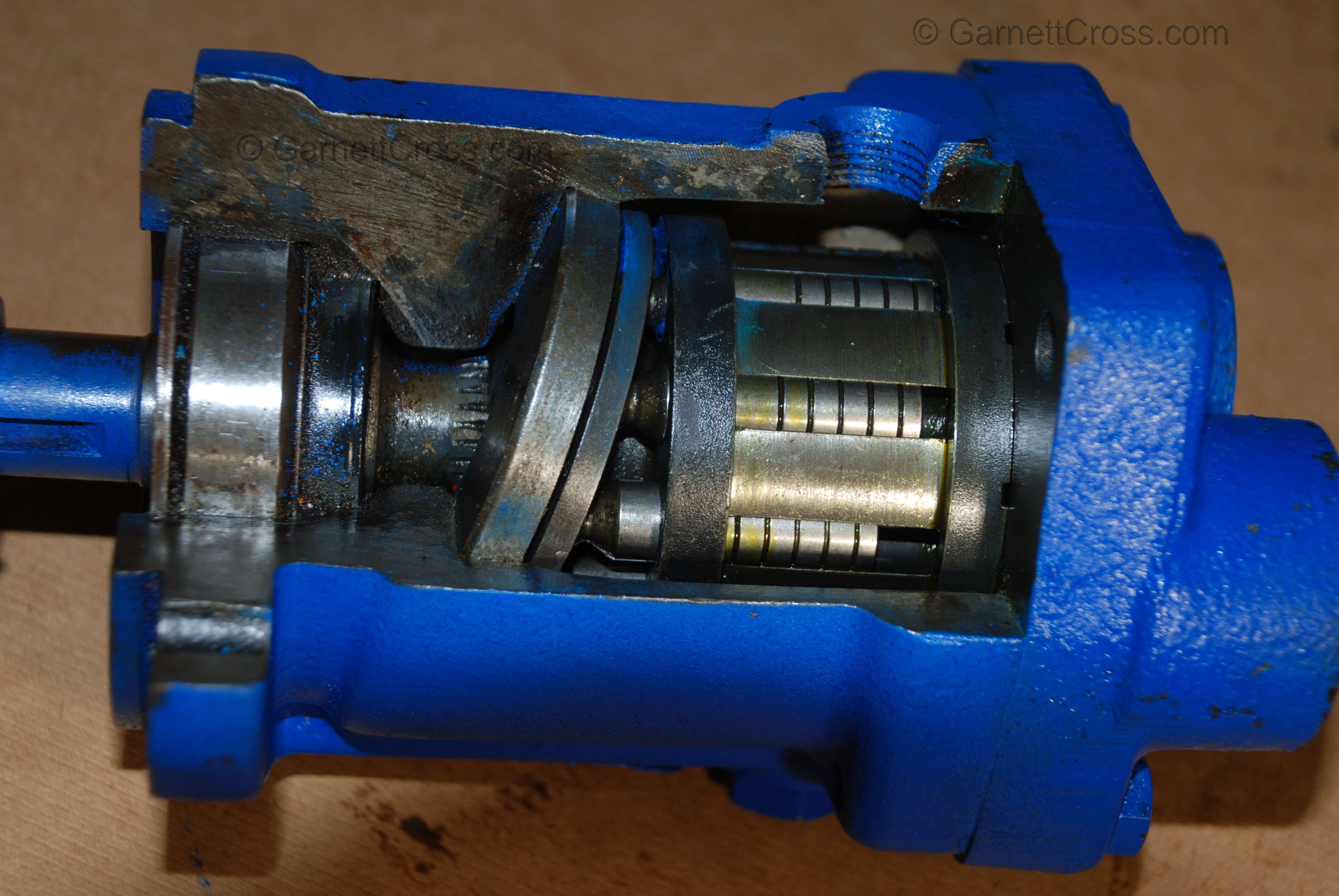 | Oil Hydraulics Piston Pump with Cut-away to expose the Rotating Group, Shoe Piston Shoe Retainer Plate, Swash Plate, Shaft, Seal, Bearing and Circlip. |