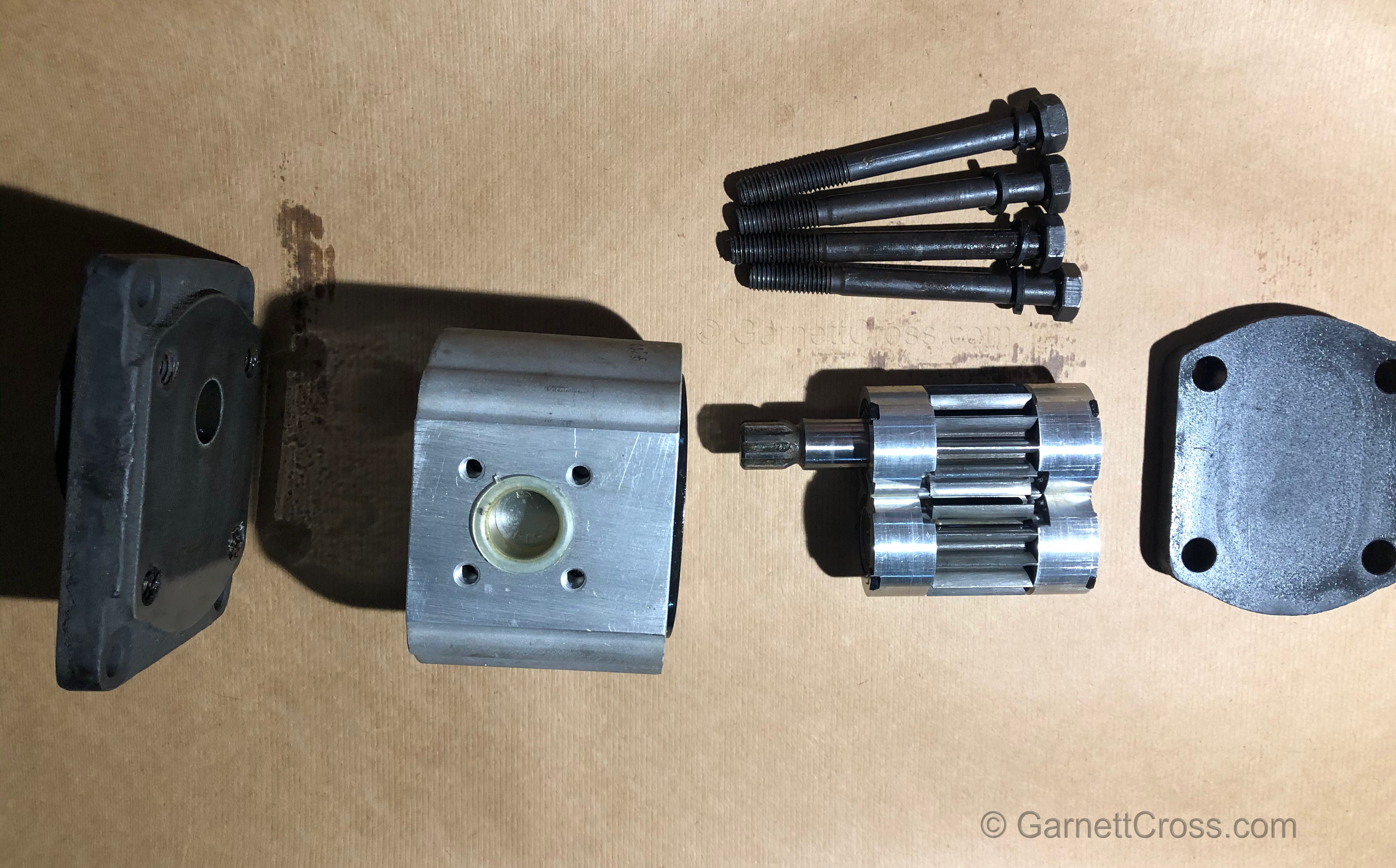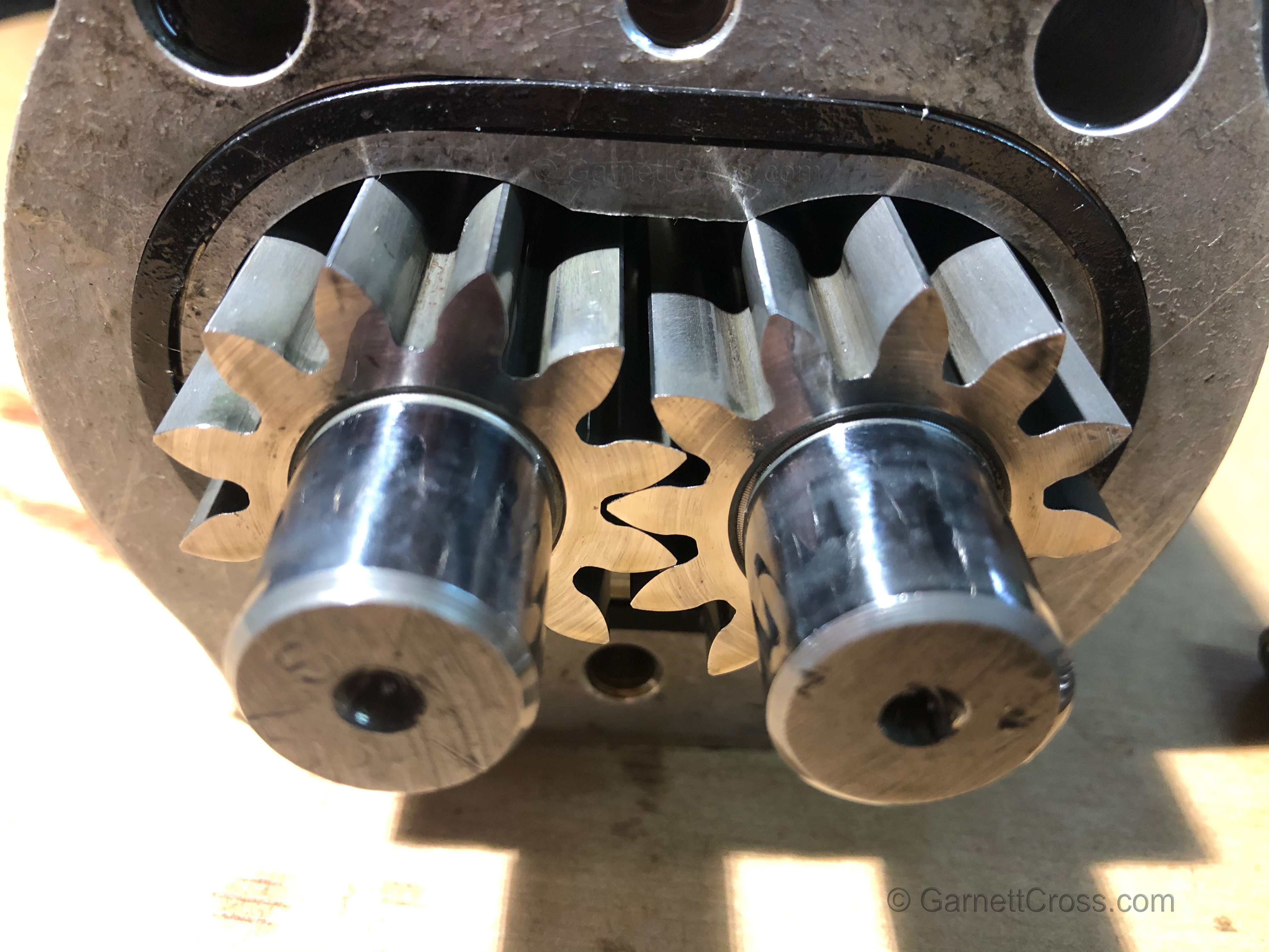 | Hydraulics Gear Pump gears Note: The oil is moved in the hollows of the teeth around the outside of each gear as the pump turns. |